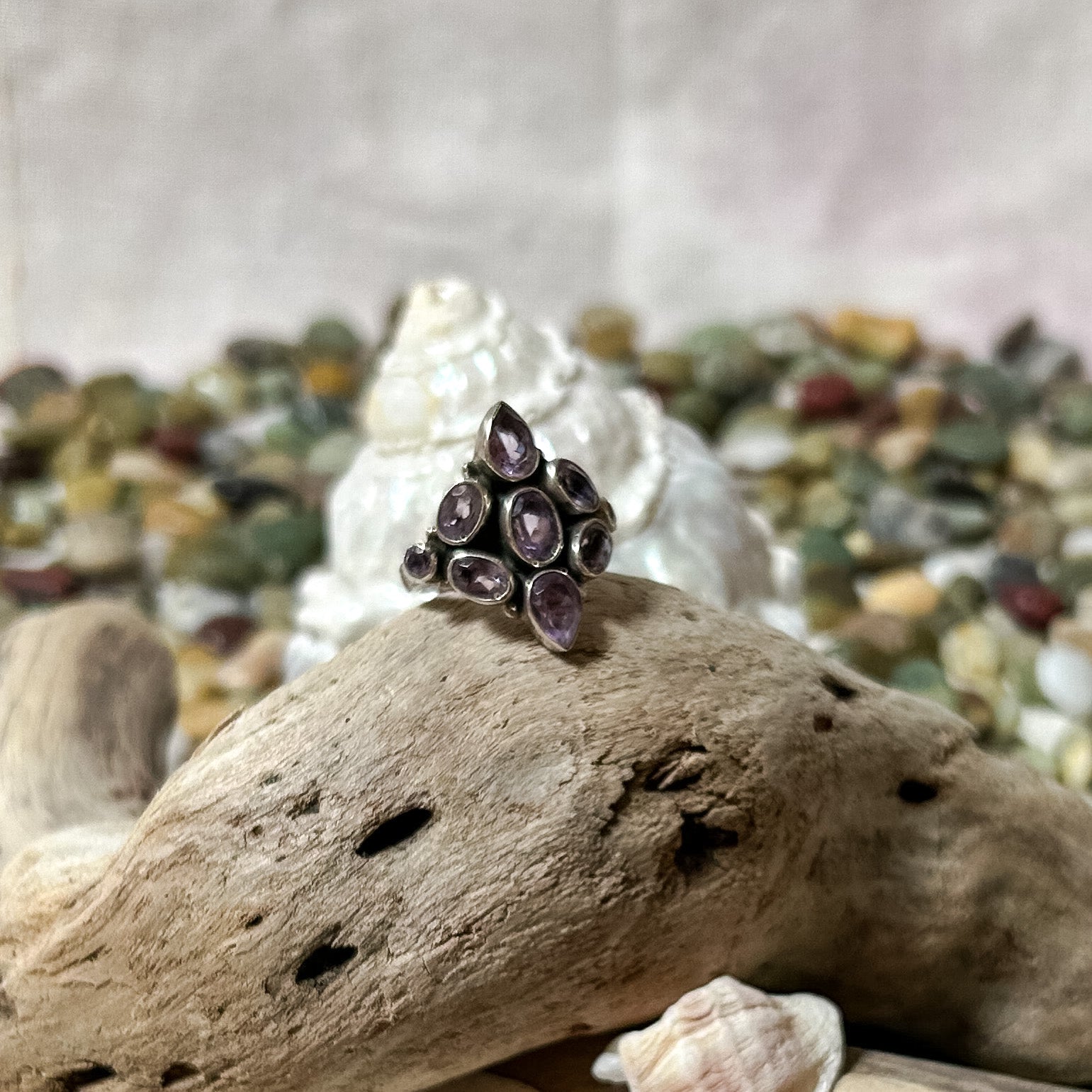 Design Features: This ring showcases 9 Amethyst stones set in a classic pattern of elegance